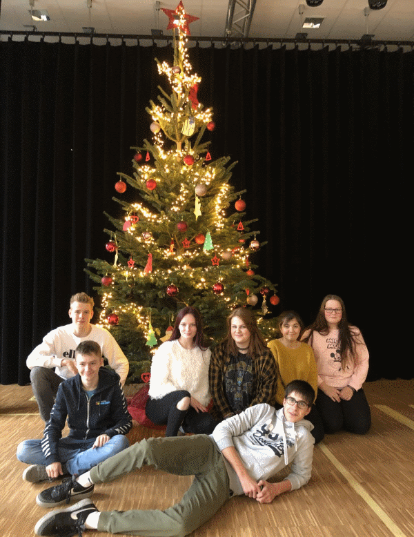 Es ist inzwischen eine von allen geschätzte Tradition, dass in der Aula ein großer Tannenbaum aufgestellt wird. In diesem Jahr haben Schülerinnen und Schüler der Klasse 10C von Herrn Wiedemann geholfen, den fast 4 Meter hohen aufzustellen und weihnachtlich zu schmücken. Besonders für das Weihnachtssingen ist der Tannenbaum eine wunderbare Kulisse!