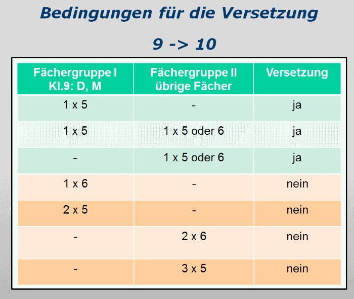 Die Gesamtschule umfasst in der Sekundarstufe I die Klassen 5 bis 10. In die Klassen 6 bis 9 gehen die Schülerinnen und Schüler jeweils ohne Versetzung über. Für die Versetzung von der Klasse 9 in die Klasse 10 werden die im Bild dargestellten Leistungen vorausgesetzt.