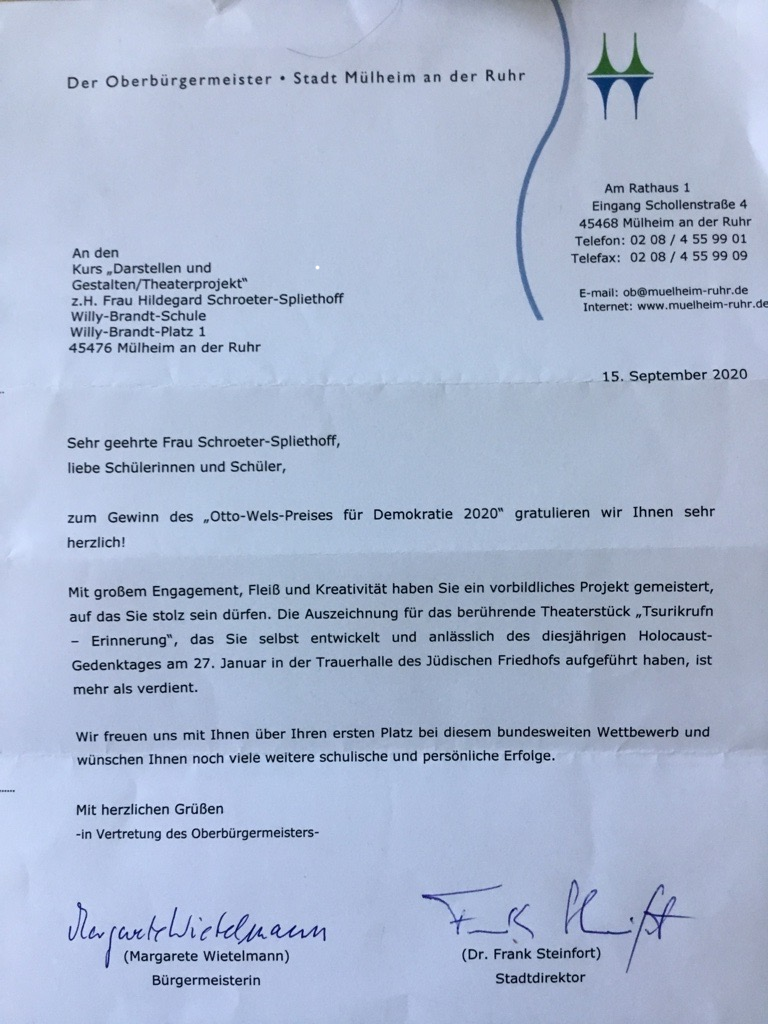 Wir freuen uns sehr über die Gratulationen und Anerkennung der Bürgermeisterin und des Stadtdirektors unserer Stadt Mülheim im Rahmen der Preisverleihung des Otto-Wels-Preises.