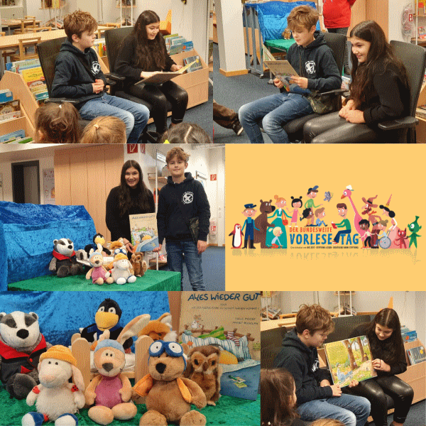 Der Schulsieger und die Zweitplatzierte des diesjährigen Vorlesewettbewerbs, Jonathan Düding und Aysima Polat, haben Grund- und Vorschulkindern aus dem Buch „Alles wieder gut! „ oder „Wie der Rabe Socke zu seinem Namen kam“ vorgelesen.