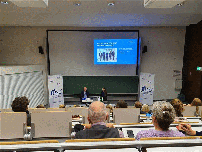 Nach dem Vortrag gab es die Möglichkeit im Hörsaal Fragen zu stellen. Hier trauten sich neben den Studierenden auch einige Schüler*innen Fragen an den Professor zu stellen. Abschließend trafen wir als Leistungskurs Herrn Prof. Truger exklusiv, um Fragen zu klären und zu diskutieren.