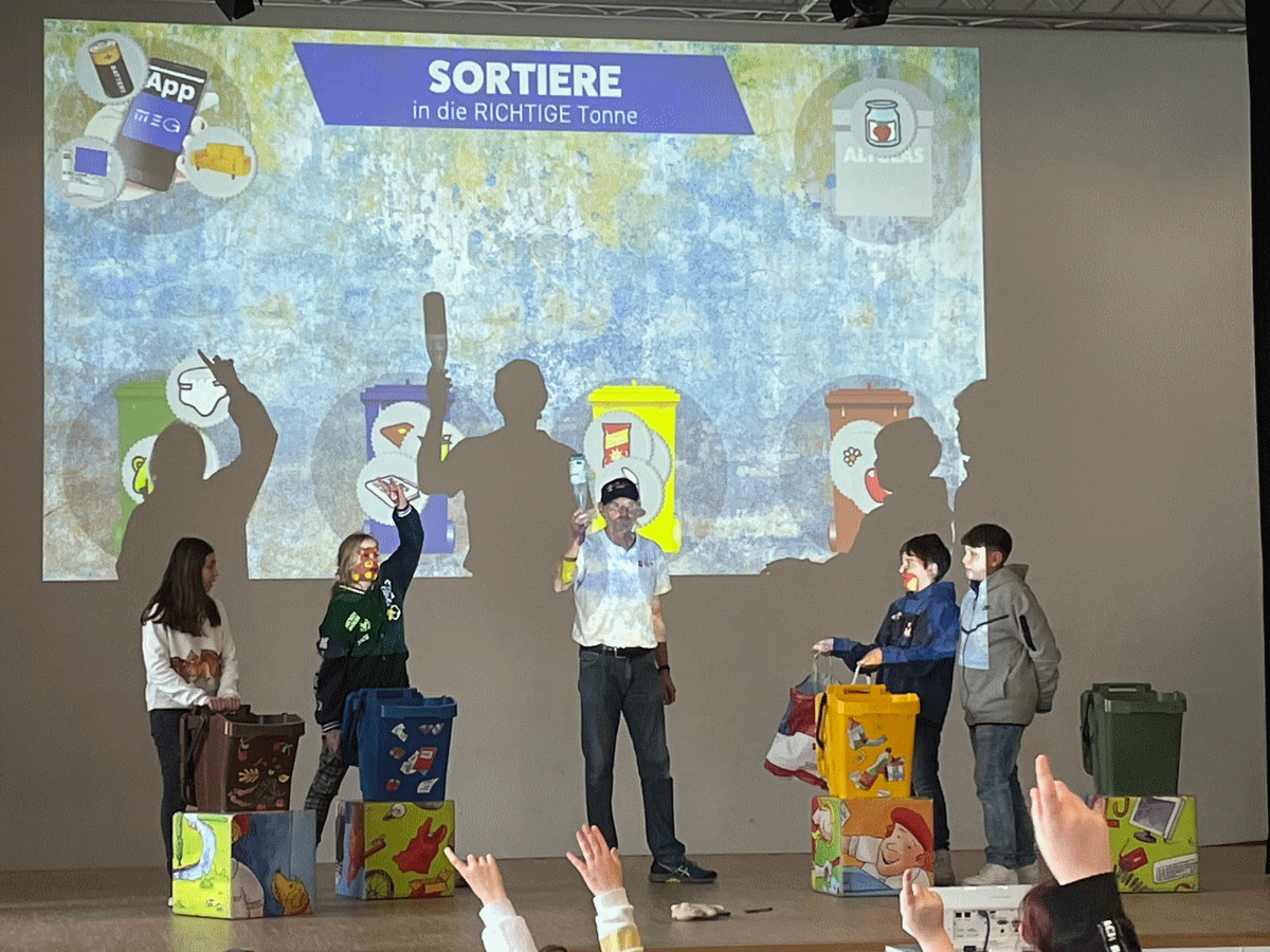 Auf unterhaltsame Art hat der Mülheimer Künstler Friedhelm Susok die Mülltrennung dargeboten. Es wurde mit Spaß gelernt und zudem ist der richtige Umgang mit unseren blauen Papiermülltonnen wieder in das Bewusstsein der Schülerinnen und Schüler gerückt worden. Sie haben auf eindrucksvolle Weise erfahren, welche Wertstoffe und Abfälle in welche Mülltonne gehören bzw. mussten dies auf der Bühne selber herausfinden.
