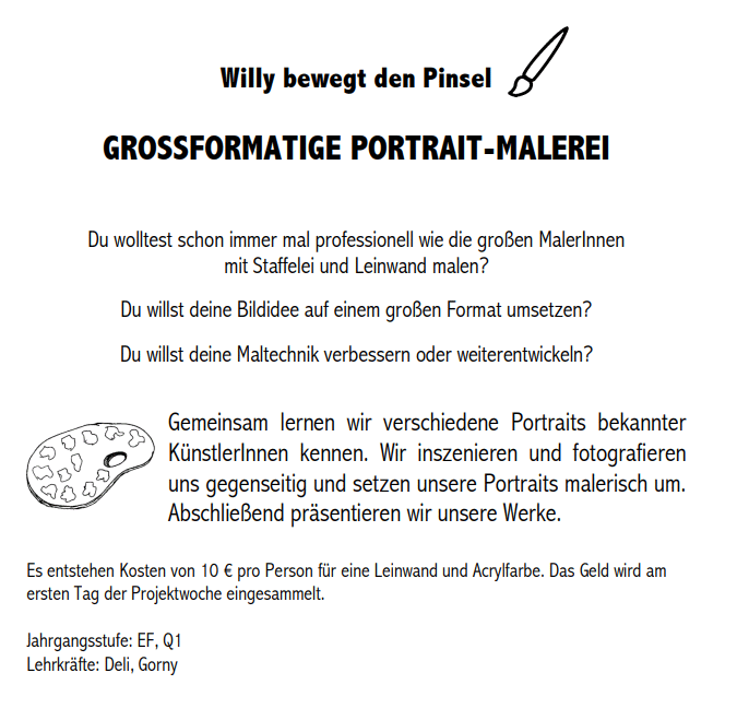 Gemeinsam lernen wir verschiedene Portraits bekannter KünstlerInnen kennen. Wir inszenieren und fotografieren uns gegenseitig und setzen unsere Portraits malerisch um. Abschließend präsentieren wir unsere Werke.
