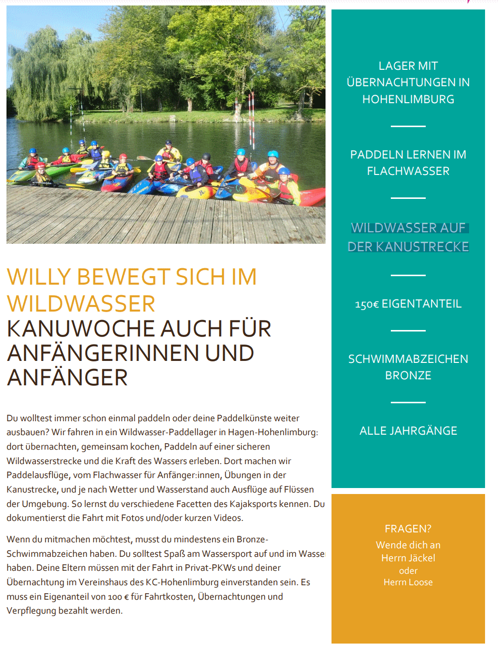 Wenn du mitmachen möchtest, musst du mindestens ein Bronze Schwimmabzeichen haben. Du solltest Spaß am Wassersport auf und im Wasser haben. Deine Eltern müssen mit der Fahrt in Privat-PKWs und deiner Übernachtung im Vereinshaus des KC-Hohenlimburg einverstanden sein. Es muss ein Eigenanteil von 100 € für Fahrtkosten, Übernachtungen und Verpflegung bezahlt werden.