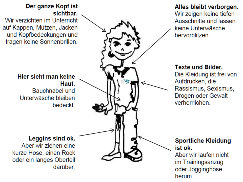 "Unsere Schule ist ein öffentlicher Ort und daher haben wir grundsätzlich alle das Recht, frei über die Wahl unserer Kleidung zu entscheiden. Wichtig bei der Auswahl ist, dass wir niemand anderen damit irritieren." so ein Auszug aus der Schulordnung. Zu dieser "Kleidungspräambel" sind Zeichnungen mit kleinen Empfehlungen entwickelt worden, die allen die Kleidungswahl erleichtern sollen.